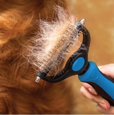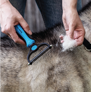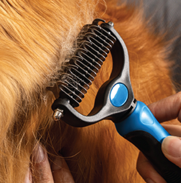 Inizia con il lato 9 denti per aprire i nodi e i feltri, con passate lente nel verso del pelo. Poi passa al lato 17 denti per sfoltire il sottopelo e uniformare.